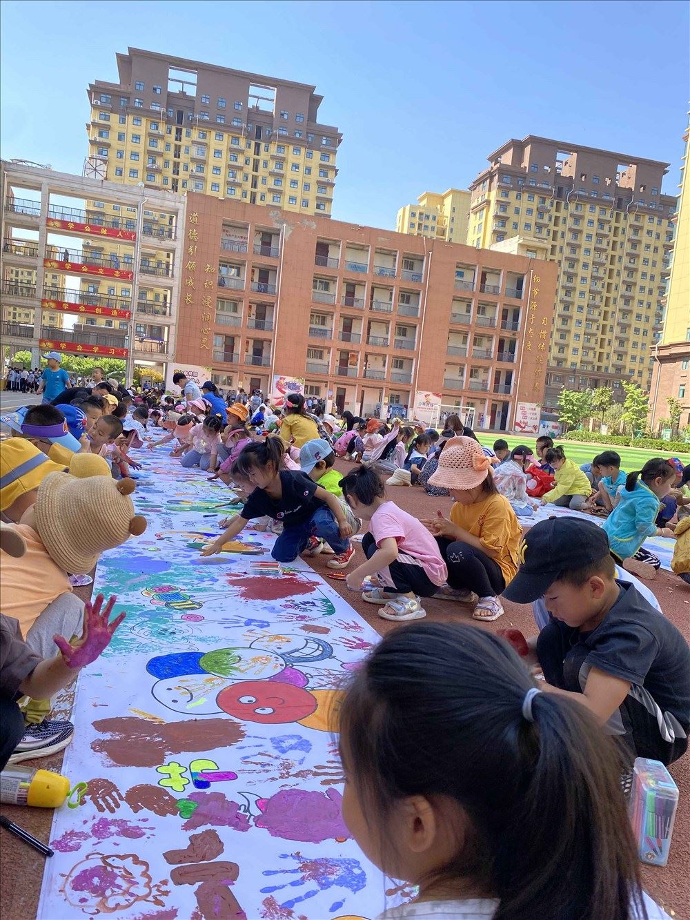 近期枣庄薛新区华书店在临城中心幼儿园开展了以“欢度六一 彩绘童年”为主题的活动。活动现场,在老师的带领和指导下,300多名“小画家”一起来到操场,孩子们带着自己心爱的画笔、彩盒,用自己纯朴的童心和稚嫩的小手,在长长的画卷上勾勒出一幅幅活泼可爱的图画,描绘出心中的美好梦想和对祖国的热爱。孩子们或跪、或趴、或蹲,挥笔勾线、泼墨涂色,经过一个多小时的集体创作,一幅幅栩栩如生的画面跃然于画布上,有的画出了自己居住的水碧天蓝的家园,有的描绘着自己五彩斑斓的梦想,有的彩绘着自己与同伴快乐的游戏……一条线、一点墨,闪耀着孩子们创作的灵光、洋溢着孩子们快乐的童年生活!活动的开展不仅丰富了儿童们的精神文化生活,陶冶了同学们的情操,更表达了学生对祖国美好的向往和祝愿。