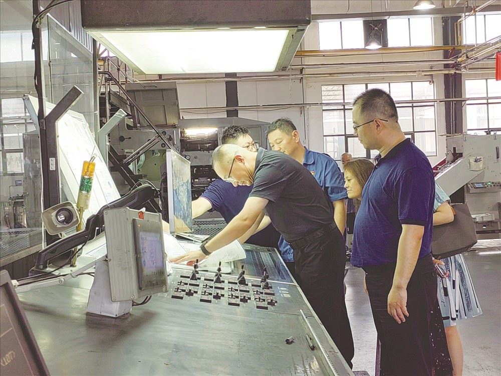 7月10日,中宣部印刷发行局二级巡视员路洲,山东省委宣传部印刷发行管理处处长盛利一行到新华印务济南分公司检查2023年秋季教材印制工作,调研国家印刷示范入选企业情况。山东新华印务有限公司董事长肖刚等人陪同调研。