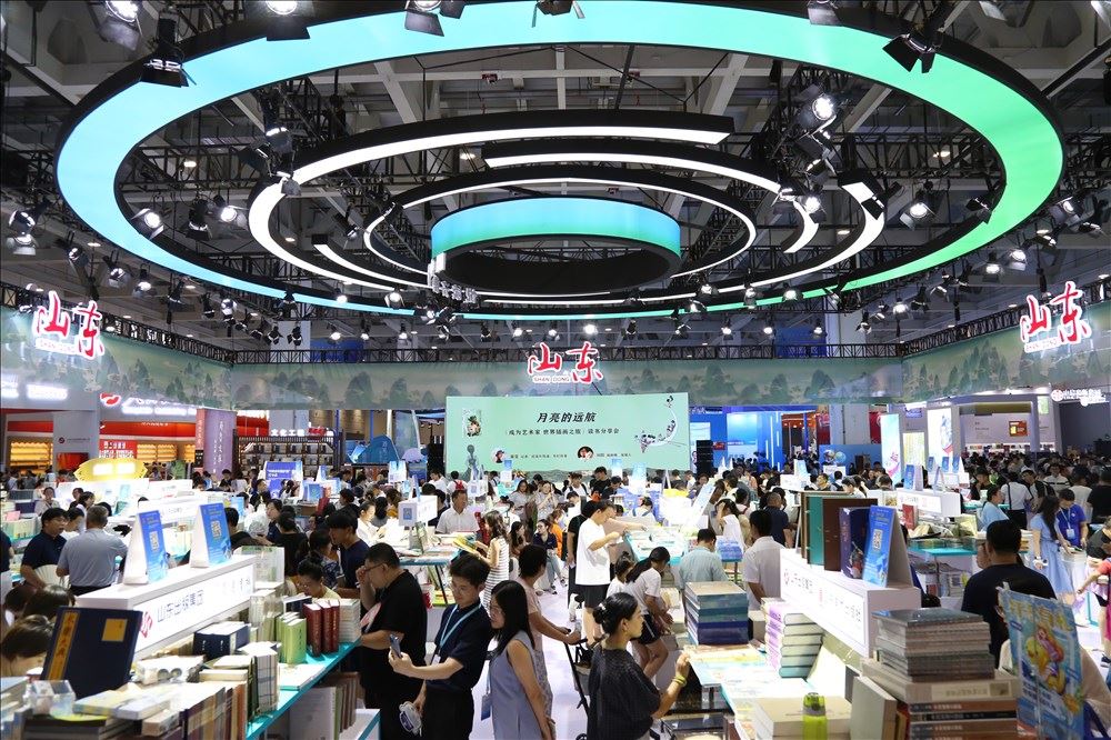 本届书博会,在安全第一、立足实效的基础上,山东展场充分复盘上两届办展情况,展场设计由厚重的孔庙大殿风格转为海岱青蓝色调的清新国潮范。展区以矩阵式陈列着《儒典》《齐书》《齐鲁文库》《黄河大系》的大型书模,重点展示体现集团文化传承的精品工程图书,不仅有视觉冲击力,更是网红打卡地;精品出版展台“走在前,挑大梁”的主题语尤为显眼,主题出版、传统文化、名家力作、精品畅销四个部分的图书无论从内容编辑、还是装帧设计都是“闭眼入”的好书;混合现实阅读体验区是小朋友们的最爱,明天社出版的图书《飞翔的鸟窝》《遨游吧,蛟龙号》在科技的加持下,让读者有了360度沉浸式体验。
