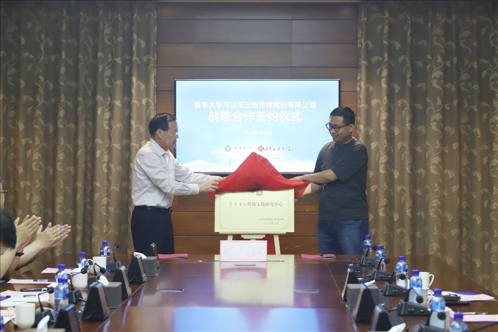 申维龙、钱国旗代表双方签署战略合作协议,齐鲁书社、鲁东大学有关负责人为“齐鲁书社传统文化研究中心”揭牌。