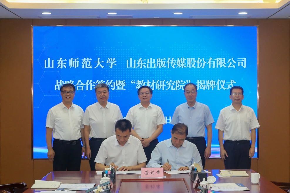 申维龙、许双庆代表双方签署战略合作协议。股份公司、山东师范大学有关负责人为“教材研究院”揭牌。