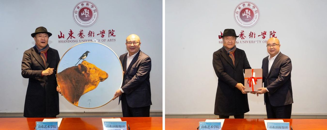 山东艺术学院院长徐青峰,集团党委副书记、董事、总经理郭海涛代表双方互赠纪念品。