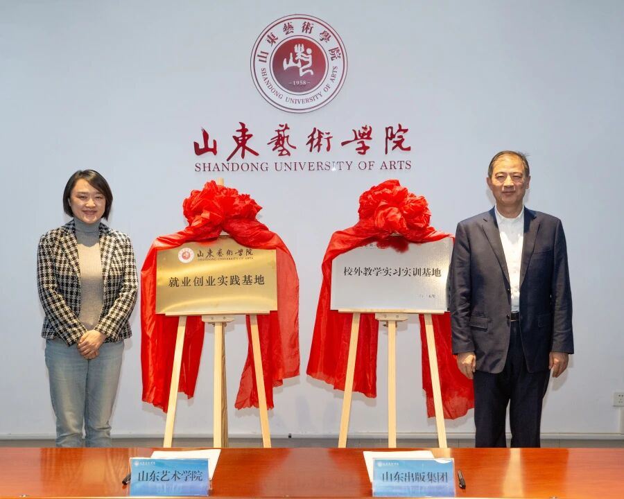 集团党委副书记、董事、总编辑申维龙与艺术学院副院长彭丽为校外教学实习实训基地、就业创业实践基地揭牌。