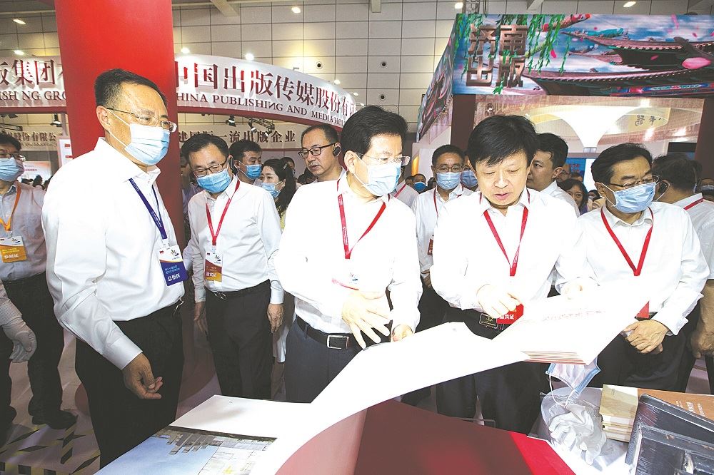 第30届全国图书交易博览会期间,中宣部副部长张建春一行到全国图书交易博览会展场调研。在银河首页官网展区,集团董事长张志华简要汇报了集团70年来在编辑、印刷、发行、物资供应、对外贸易等方面的发展情况。在庆祝建党100周年主题展暨出版物精品展台前,张建春驻足观看《为了新中国——革命烈士纪念碑碑文敬读》,并详细了解集团在主题出版以及走出去出版物和融合发展等方面的情况。随后,张建春来到山东书城,现场调研新华书店在转型升级、多元融合、互联网化探索等方面的情况。