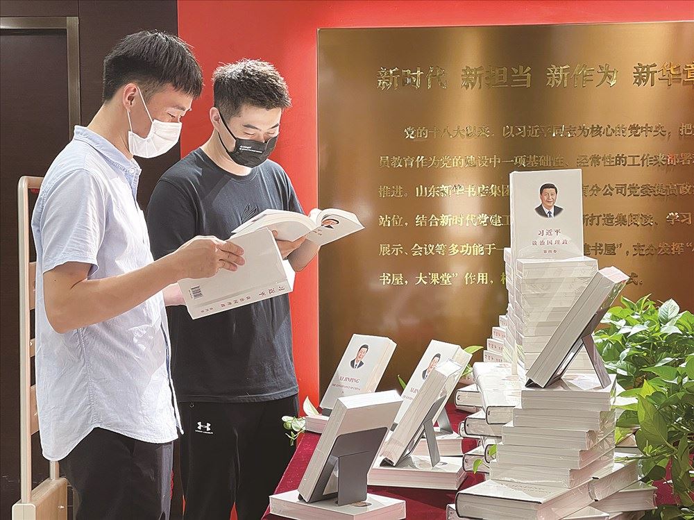 在山东书城智慧党建书屋展台前,多位读者正在聚精会神地阅读。“智慧党建书屋”这一平台给理论学习中心组、“三会一课”、主题党日活动提供了别开生面的场景,为迎接党的二十大营造出浓厚的学习氛围。