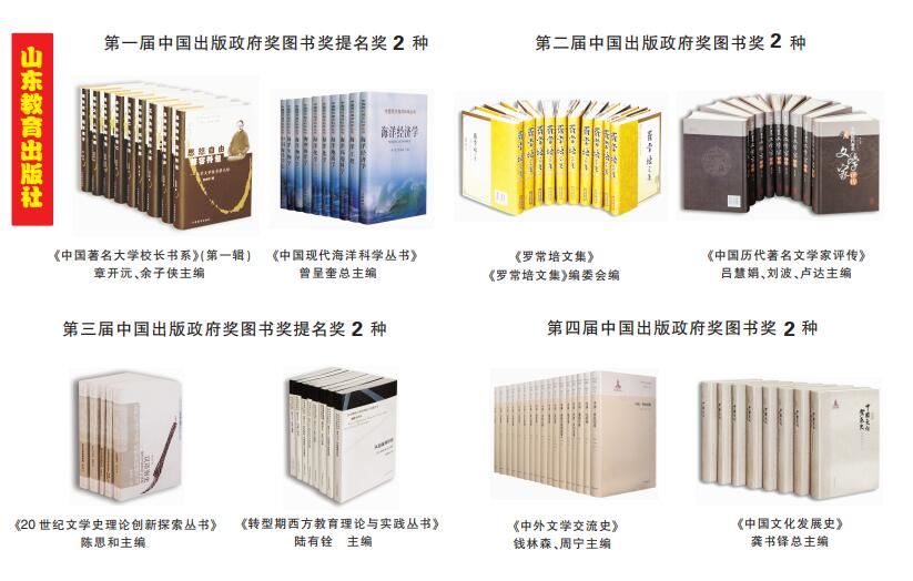 尤其值得一提的是山东教育出版社,连续5届10种图书荣获中国出版政府奖(图书奖4种,图书奖提名奖6种),历届中国出版政府奖获奖图书数量在全国出版社中排名第七位,地方出版社排名第一位,充分体现了教育社的精品出版成效和品牌影响力。