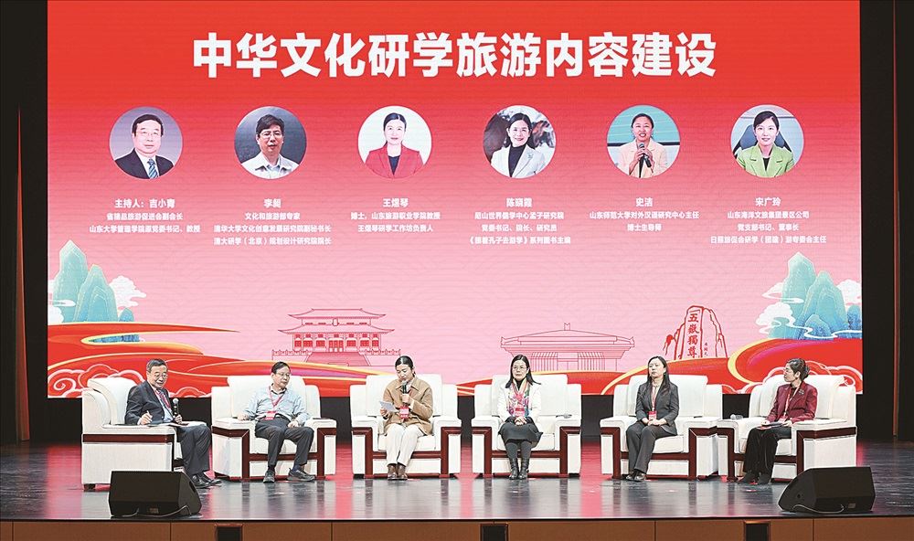 专家讲座和圆桌论坛环节,全国政协常委、国际儒学联合会副会长、山东大学讲席教授、山东大学儒学高等研究院院长、《文史哲》名誉主编王学典,文化和旅游部“十四五”规划专家委员会委员、世界旅游城市联合会专家委员会副主任、北京交通大学现代旅游研究院院长、教授张辉分别做《中华优秀传统文化的核心与精华:儒学的本来面目及特征》、《研学旅游高质量发展》主题演讲,清华大学文化创意发展研究院副秘书长、文化和科技融合研究中心执行主任研究员李昶,山东旅游职业学院教授、山东省精品旅游促进会研学和红色旅游分会专家王煜琴,尼山世界儒学中心孟子研究院党委书记、院长、研究员、《跟着孔子去游学》系列图书主编陈晓霞,山东师范大学对外汉语研究中心主任、博士生导师、山东省智慧教育研究院理事长、中国中小学语文教材国家建设重点基地兼职研究员史洁,日照东方太阳城景区运营管理有限公司支部书记、董事长兼经理宋广玲,围绕中华文化研学旅游内容建设这一主题进行了对话研讨。