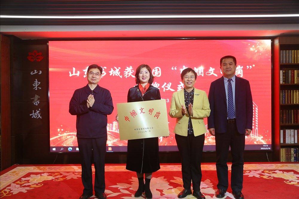 3月16日下午,山东书城获全国“巾帼文明岗”授牌仪式举行。山东省妇女联合会党组成员、副主席王洪霞,山东省委省直机关工委副书记王树山,为获得全国“巾帼文明岗”的山东书城进行授牌。集团党委委员、副总经理申维龙出席活动。仪式由股份公司党委委员、监事会主席王长春同志主持。