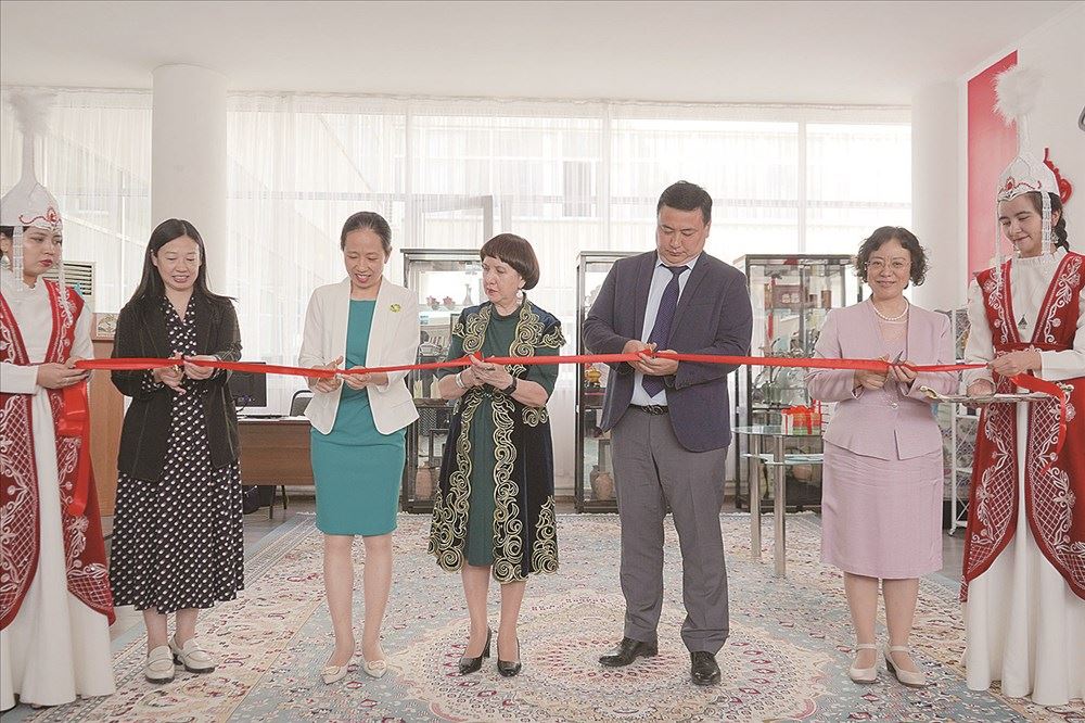 同日,哈萨克斯坦“中华文化之角·尼山书屋”落地仪式在阿拉木图国家图书馆举行。中国驻阿拉木图总领馆总领事蒋薇、阿拉木图文化局副局长D.T.朱马德利耶夫、国家图书馆馆长B.K.奥斯潘诺娃、股份公司出版工作部主任丁莉、友谊社社长何慧颖共同为尼山书屋落地剪彩。该书屋落地于2016年建成的中国馆,是该图书馆内最大的外文图书独立展馆。(教育社)