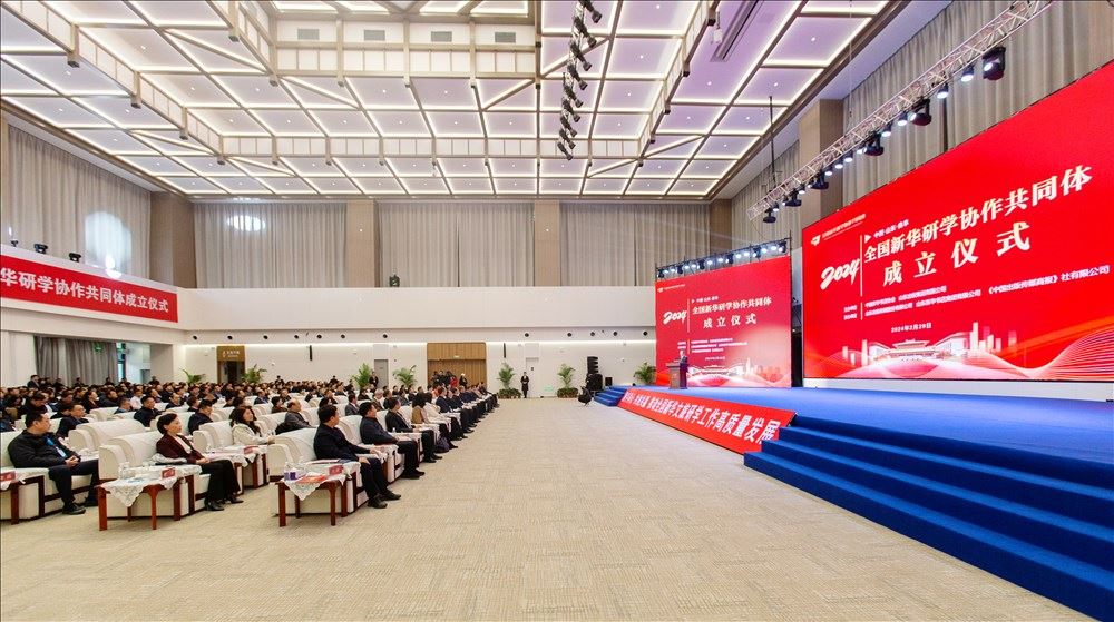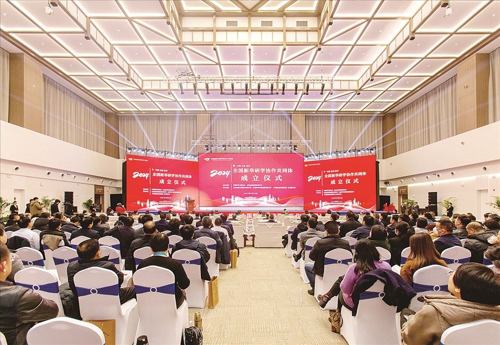 共同体成立仪式现场,黄志坚和程守田共同为“全国新华研学协作共同体”揭牌。