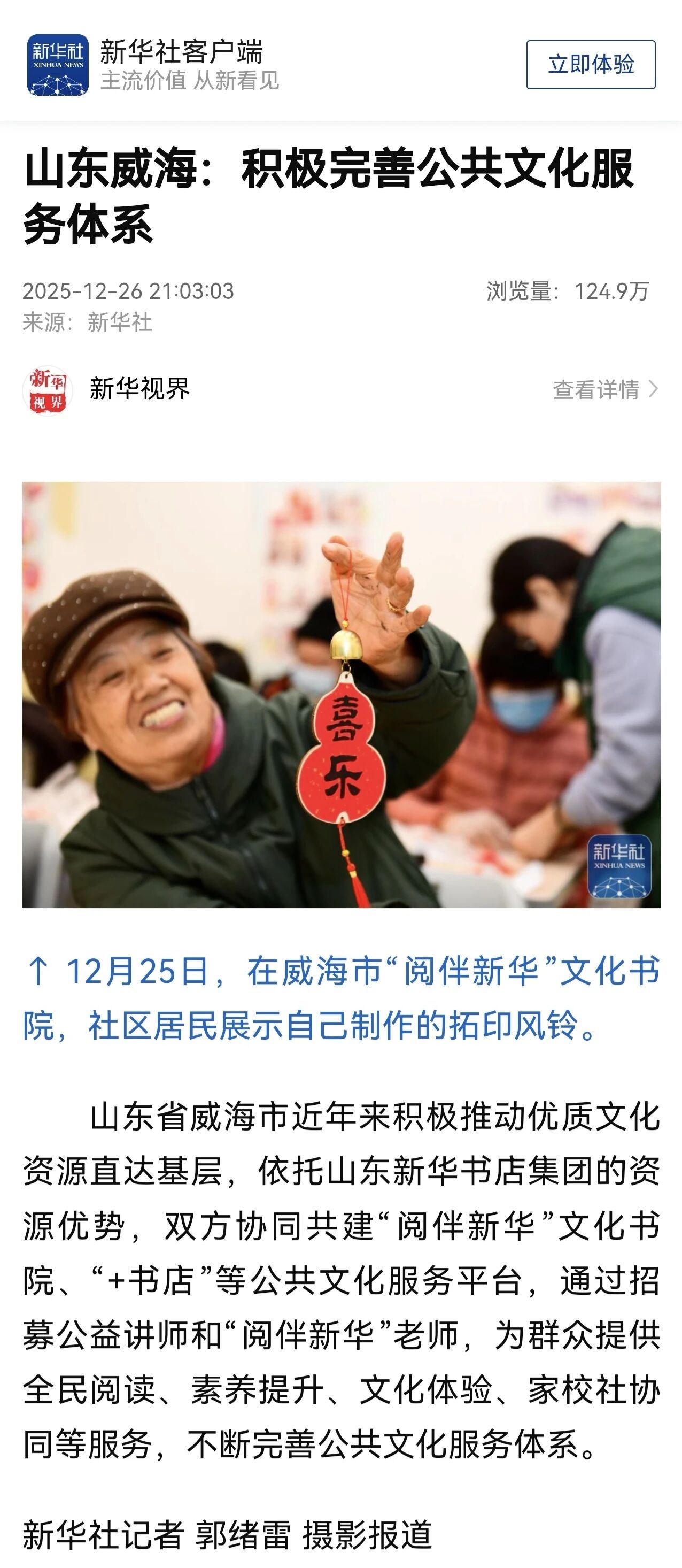 近日,新华社以《山东威海:积极完善公共文化服务体系》为题,对“阅伴新华”文化书院、“+书店”等公共文化服务平台实践成果进行了专题报道。