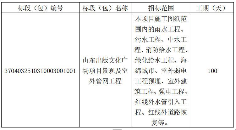 项目名称:山东出版文化广场项目景观及室外管网工程 已经由枣庄市·薛城区备案,招标人为山东书苑置业有限责任公司,工程所需资金来源为自筹,项目已具备招标条件,现对该项目的景观及室外管网工程进行公开招标。本次招标对投标报名人的资格审查,采用资格后审方法选择合适的投标申请人参加投标。