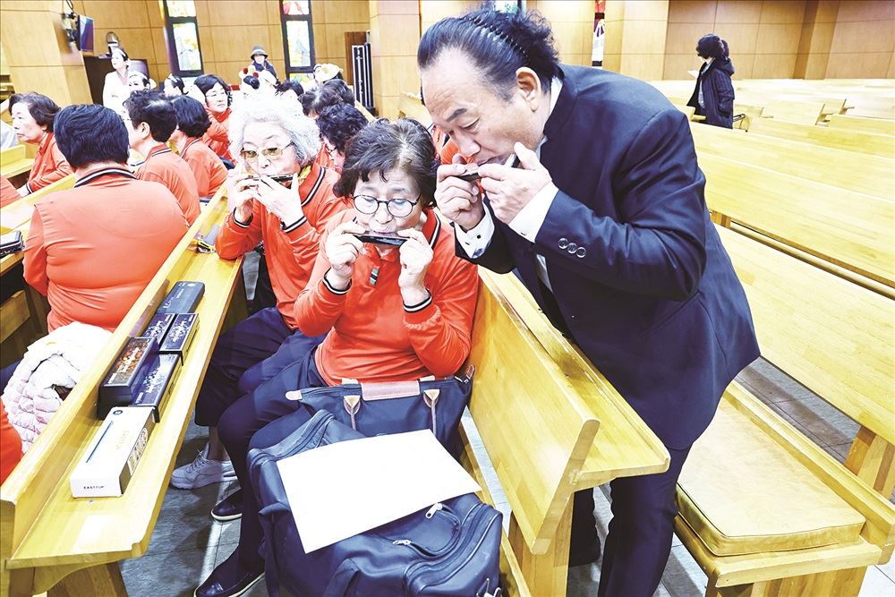 刚抵达富光老年大学,文化交流的语言隔阂就被热情的富光老年大学的学员们不太标准的中文“你好”打破了。团员们纷纷笑着用同样不标准的韩文回应 “安宁哈赛有(您好音译)”,现场其乐融融,仿佛是好久未见的老朋友间的团聚。