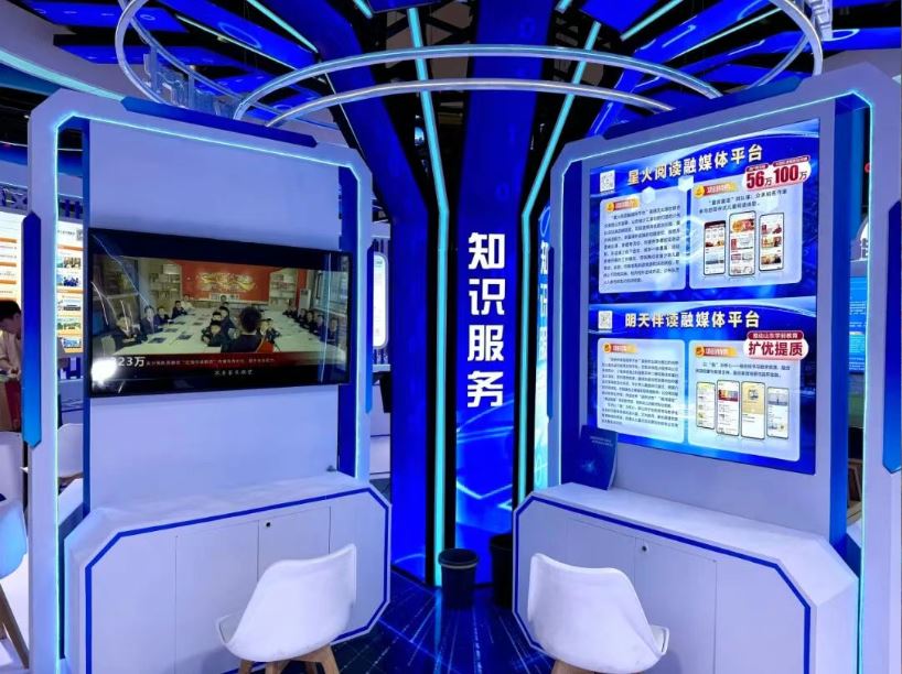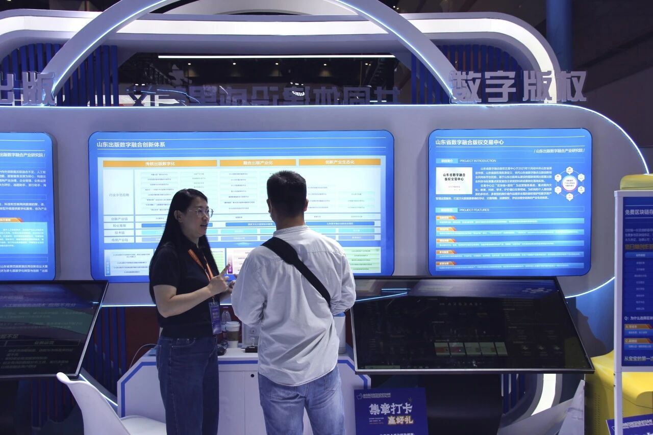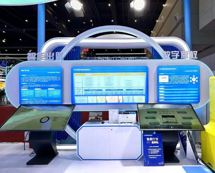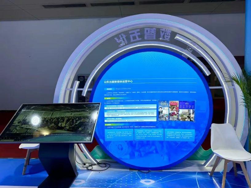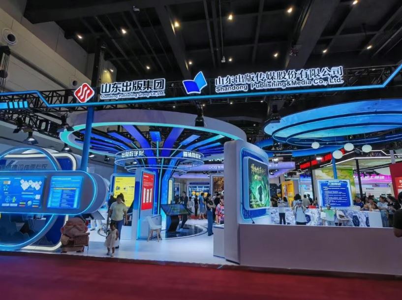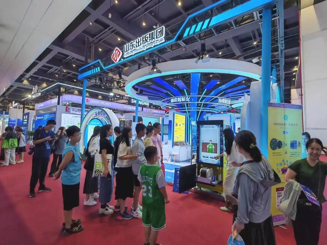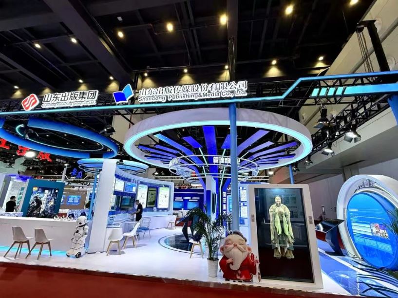 展区以“数智五化”为主题,突出“数实融合、展销一体” ,采用立体联动的宣推方式,设置智能出版、数字版权、知识服务、智慧教育、智慧文旅、智阅空间、共同体建设成果专区七大板块。集中展示了集团近年来依托人工智能、5G、大数据、云计算等新技术在融合出版领域的前沿探索与实践成果,包括山东省数字融合出版创新创业共同体、国家新闻出版署出版业科技与标准重点实验室——“融合出版内容传播创新应用重点实验室”、山东省数字与数据融合出版传媒重点实验室、出版产业大脑、山东省数字融合版权交易中心、XR大空间阅读、山东出版智慧教育平台、高等数学融合出版项目、明天伴读融媒体平台、星火阅读融媒体平台、纹明——中国图案数字资源平台、“逸品仓”——中国艺术名家数字资源平台、花苞尖尖悦课平台、轻龄数字化特色服务平台、《齐鲁文库》数据库平台、《历代诗咏齐鲁总汇》数据库、山东出版新媒体运营中心、特色研学营地集群等项目。