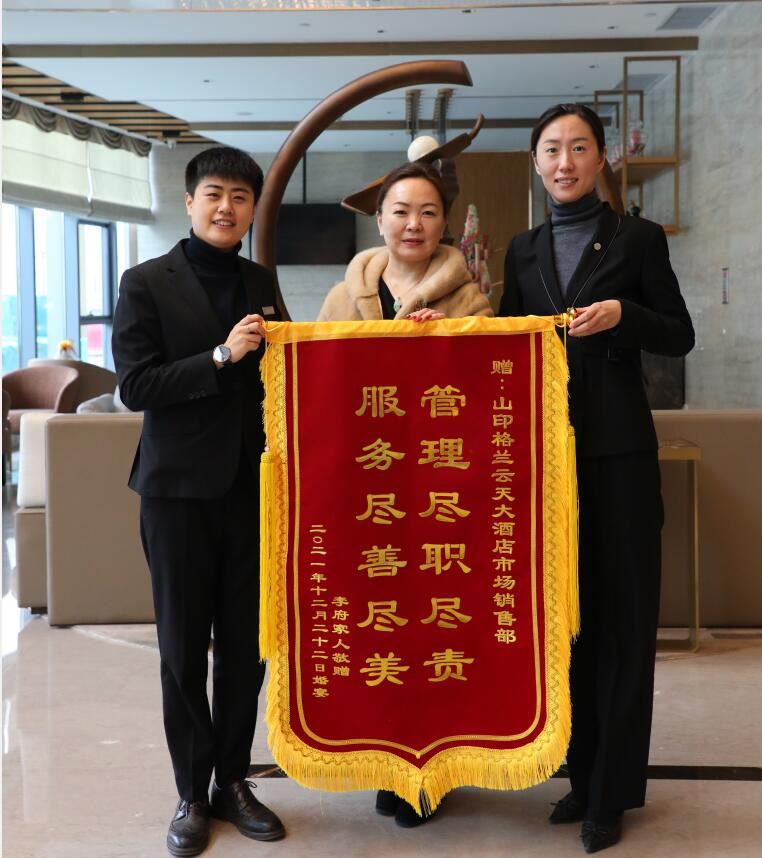 12月22日,物资公司下属的山印格兰云天大酒店收到一份特殊的礼物,是济南李先生一家带来的两面绣着“管理尽职尽责,服务尽善尽美”,“宾客至上、服务第一,体贴入微、宾至如归”的锦旗,感谢山印格兰云天大酒店周到的服务。