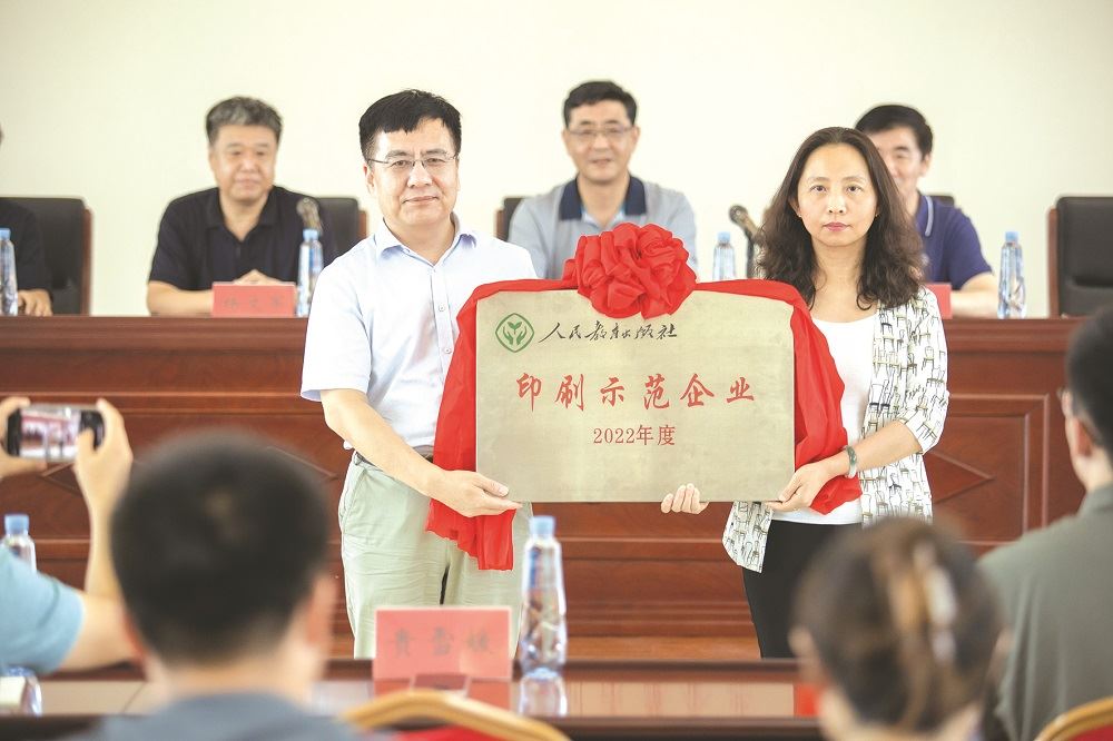 新华印务泰安分公司 7月28日, “人教社2022年度印刷示范企业”授牌仪式在新华印务泰安分公司举行。今年3月,人教社颁布了《人民教育出版社印刷示范企业认定办法》,从印装质量、优良品率、经营管理、技术设备、承印数量等方面对教材印刷企业提出了很高的要求。经过严格审核,最终在全国范围内确定了4家印刷示范企业,新华印务泰安分公司位列其中。股份公司常务副总经理宫杰在致辞中表示,股份公司的印刷板块在2020年改革重组基础上,持续深化改革,完善管理制度,圆满完成了“课前到书、人手一册”的政治任务,特别是泰安分公司,不断增强质量意识,强化质量管理,实现了教材绿色印刷、保质保量印刷。希望下一步股份公司与人教社加大合作的力度,拓宽合作的广度,增进合作的深度,为文化教育事业发展贡献力量。人民教育出版社副社长付天华在致辞中表示,希望新华印务公司继续深入贯彻落实高质量发展理念,充分发挥印刷示范企业的引领和辐射作用。授牌仪式由股份公司副总经理杨文军主持。